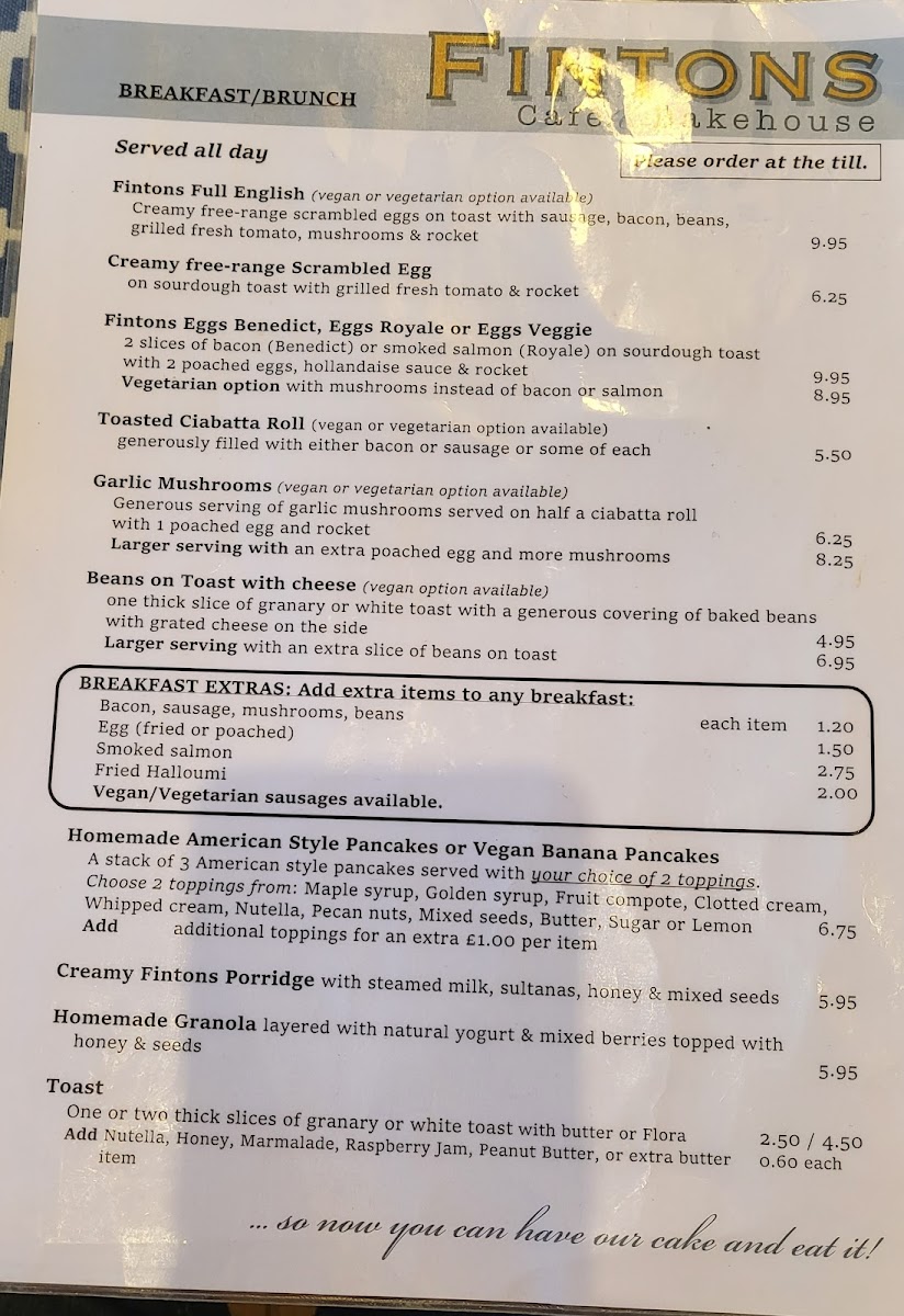 Welcome to Fintons Cafe & Bakehouse, where delightful flavors and a warm atmosphere await. Nestled in the charming village of Breaston, this cafe shines with a menu designed to cater to all tastes, including gluten-free options. Start your day with their crowd-favorite American pancakes—fluffy and generously sized—or indulge in the heavenly garlic mushrooms on ciabatta. For lunch, the Ploughman's platter stands out, featuring delectable ham and a warm cheese scone.
